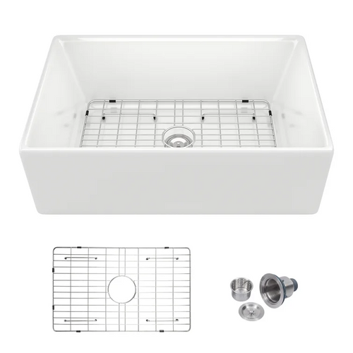 30'' W x 19'' D Farmhouse Kitchen Sink Radian Single Deep Bowl White Ceramic with Sink Grid