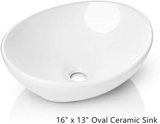 Kichae Oval Vessel Sink - 16in x13in Modern Bathroom Sink Egg Oval Shape Countertop White Porcelain Ceramic Vessel Vanity Sink Art Basin
