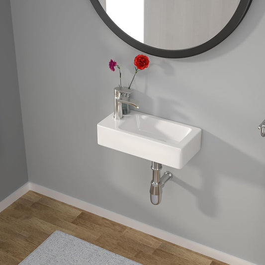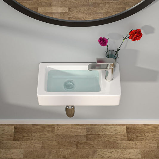 Kichae Small Bathroom Sink Wall Mounted - Wall Mounted Bathroom Sink Rectangle 15in x 7in Tiny White Ceramic Wash Basin with Faucet Hole Right Hand