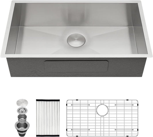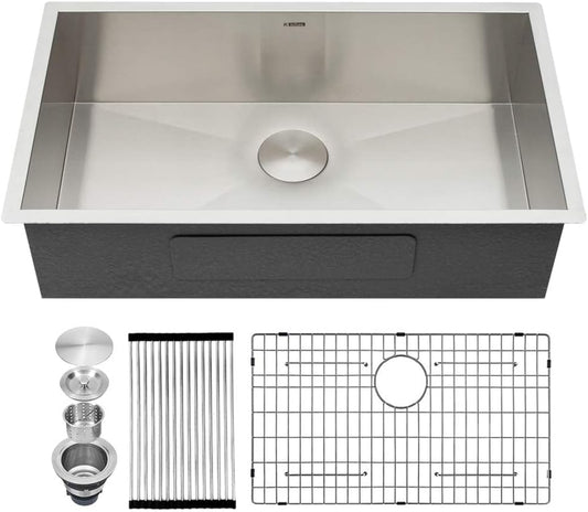Kichae 33 Inch Undermount Kitchen Sink Single Bowl Stainless Steel Kitchen Sink 33in Under Mount 18 Gauge Round Corner Kitchen Sinks Deep Basin 33x19x9 Inch