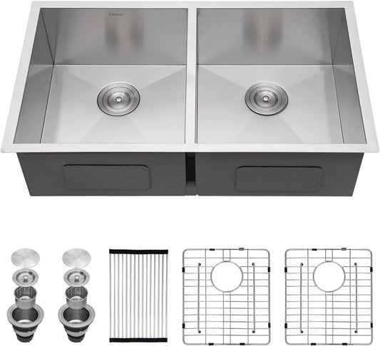 Kichae 33 Inch Undermount Kitchen Sink Double Bowl 50/50 Stainless Steel 18 Gauge Under Counter Kitchen Sink Handmade Basin with Drain Strainer