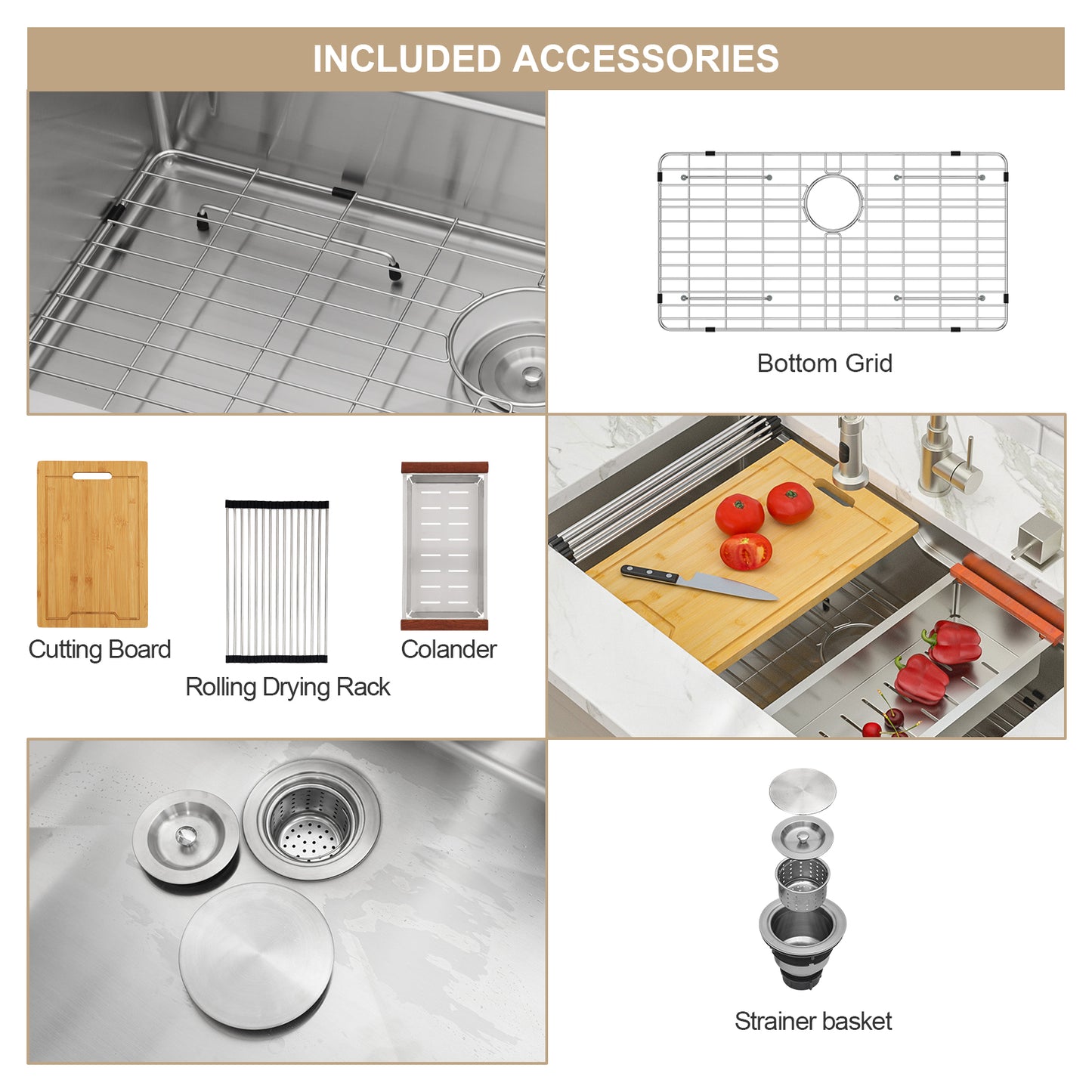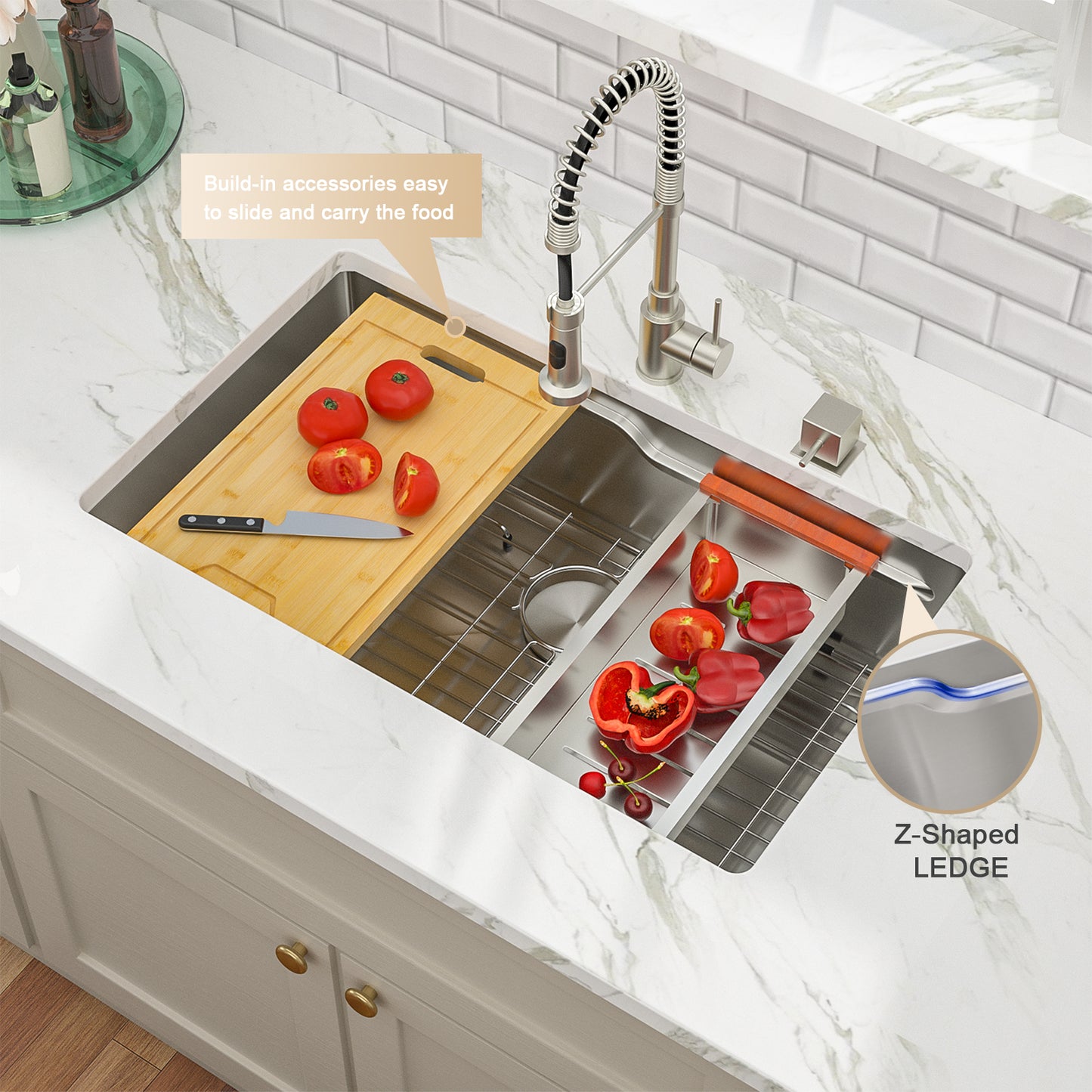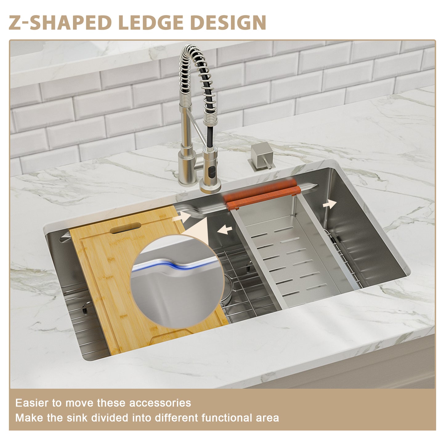 [Patent Z-Shape Single-Tier Track Design]: This 33" workstation sink is designed with Z-shape single-tier track for sliding the built-in accessories, bigger colander and cutting board make the sink divided into different functional area that can wash and drain at the same time and more convenient cleaning things and provide more space for pots and pans .