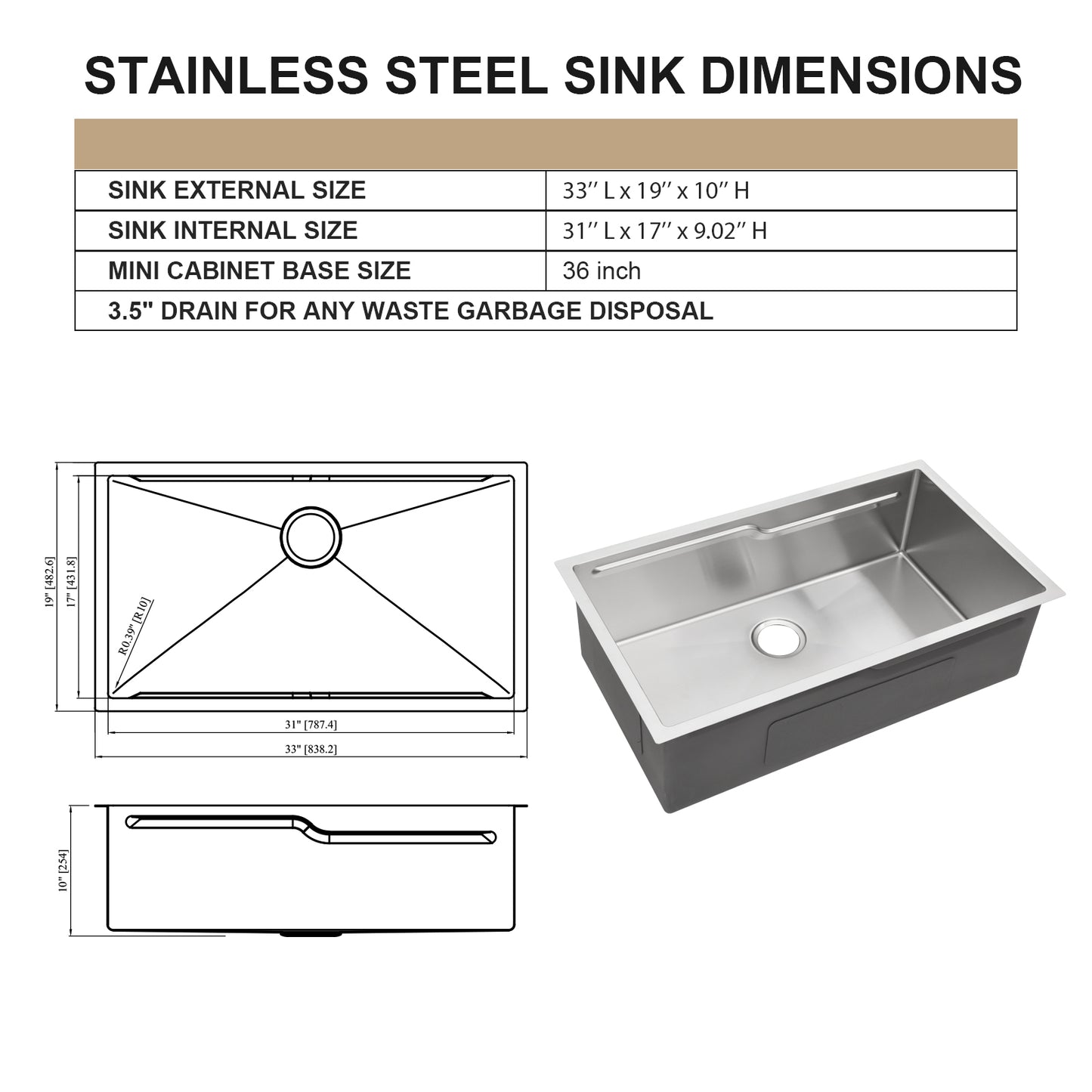 [Size;Sink Accessories]: Exterior Dimensions: 33"L x 19"W x 10"D, Interior Dimensions: 31"L x17"W x 10"D|Minimum Cabinet Size: 36 Inch|Standard 3-1/2" drain opening