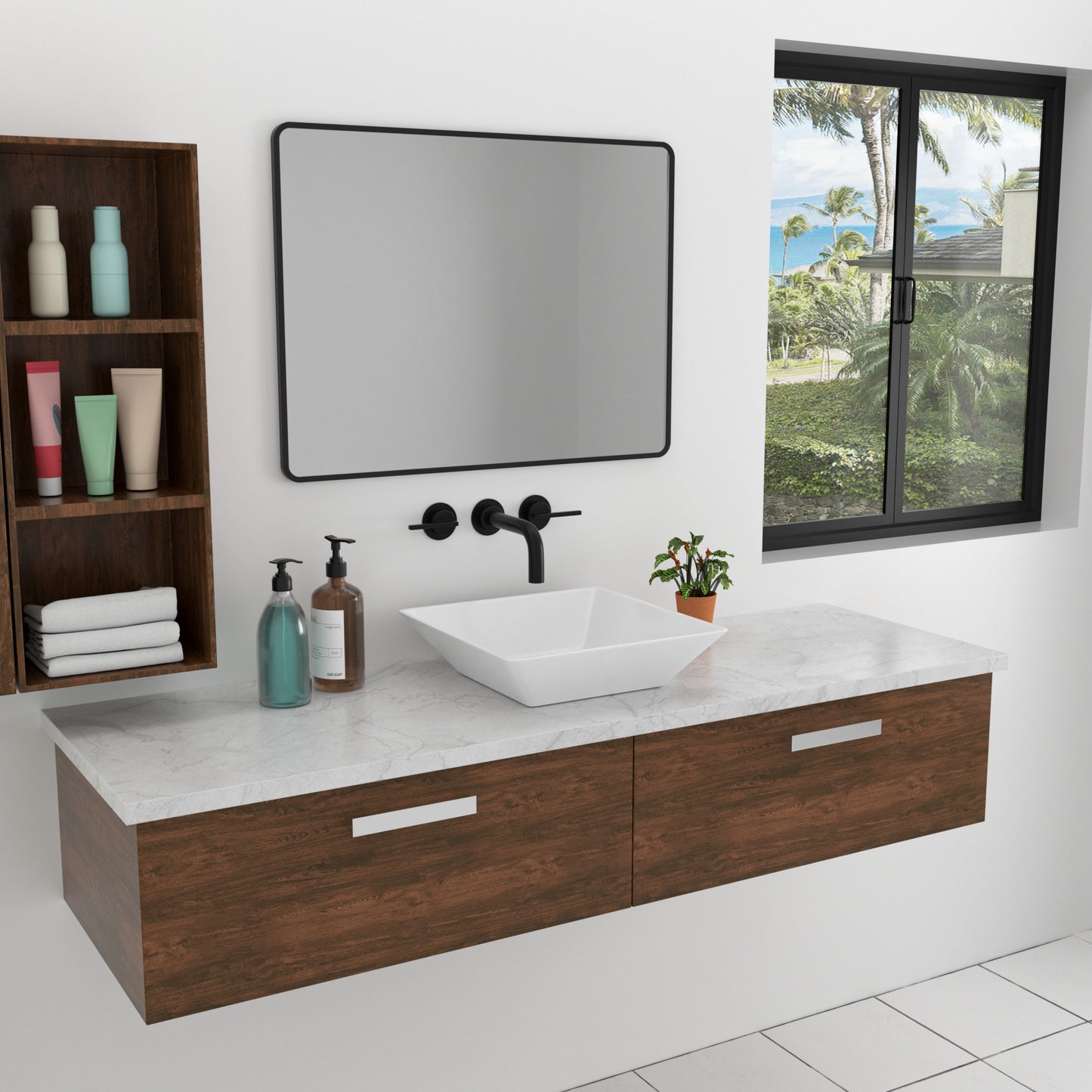 The Kichae 16 Inch Modern Square Bathroom Vessel Sink has dimensions of 16 inches long, 16 inches wide, and 5.5 inches high, offering ample space for everyday use. Its generous size and functional design make it suitable for various bathroom styles and configurations.
