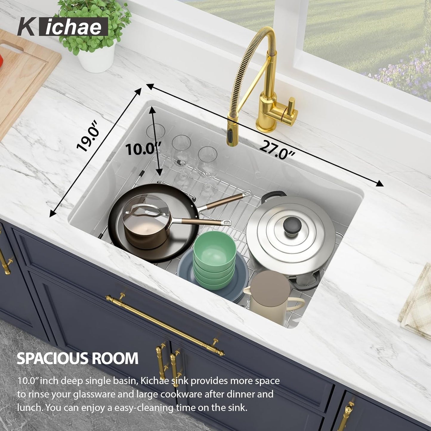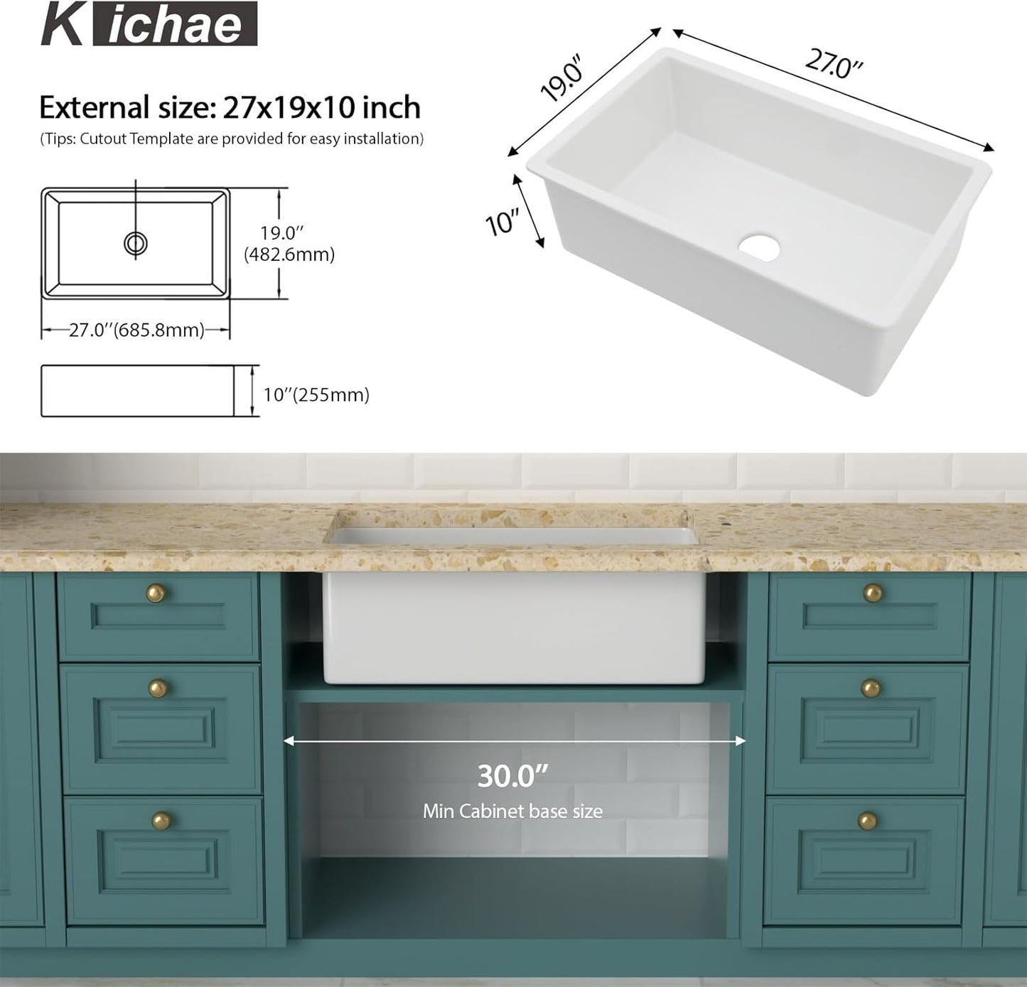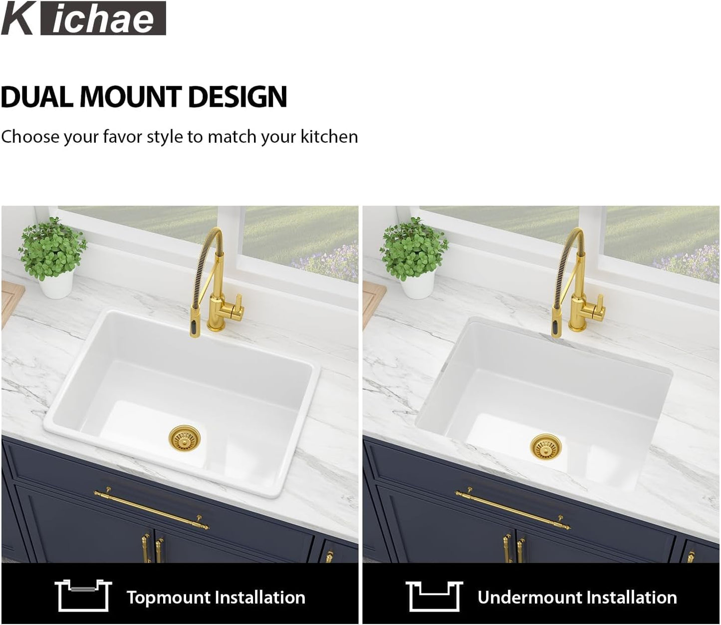- Considerate Dual Mount Design with Thick Deck: Kichae white kitchen sink is designed for topmount and undermount installation to fit different material of cabinet. The mount deck of the white drop in sink is wide & thick enough to support topmount installation. Meanwhile,it also suit for undermount installation. Both installations make your kitchen elegant and sleek.