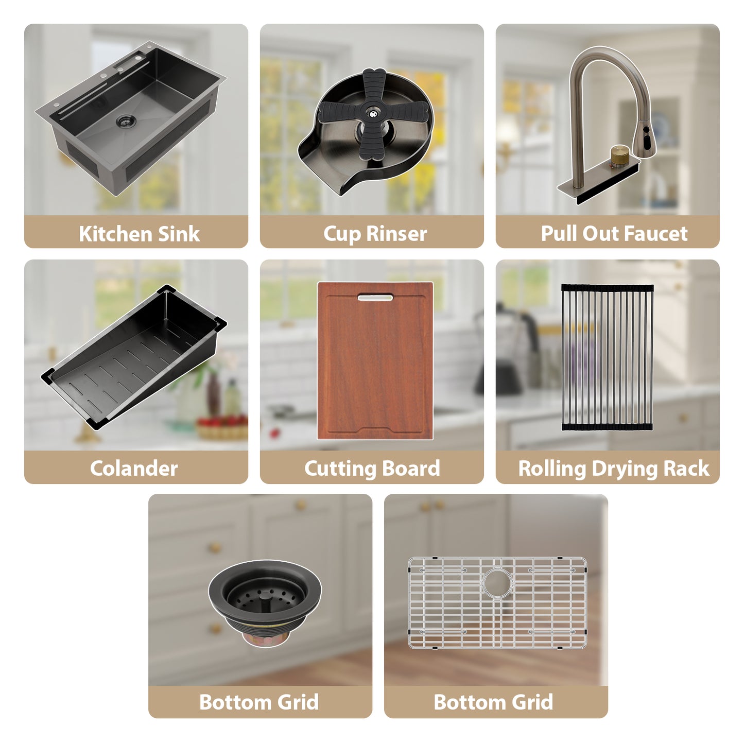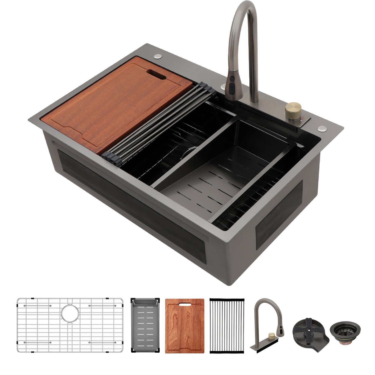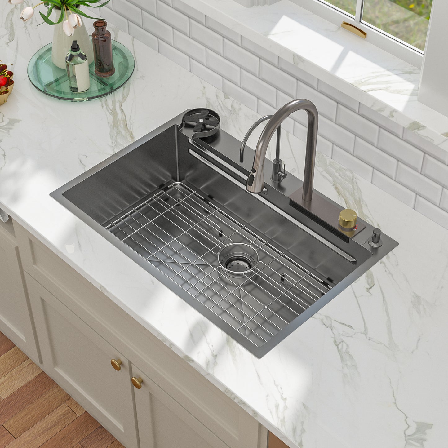 Kichae 33 Inch Drop In Kitchen Sink Waterfall Stainless Steel Single Bowl 16 Gauge Gunmetal Black Workstation Sink With Faucet Combo And Cup Washer Topmount Kitchen Sink