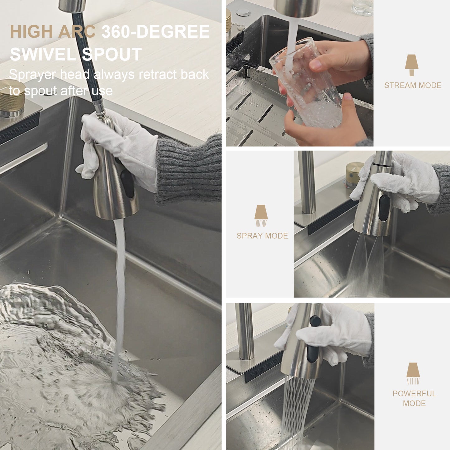 [Multifunctional Waterfall Sink & 3 Outlet Water Effect Pull Out Kitchen Faucet]- This waterfall workstation kitchen sink has two tracks to provide you with more space to use. You can slide the built-in fittings to make this kitchen sink a makeshift workspace, a multi-functional sink for you to improve kitchen efficiency. 360 Degree Pull Out Swivel Nozzle Kitchen Tap offers 3 spout settings (powerful, spray, stream), with a choice of different water flow patterns to suit your needs. The kitchen sink's addition is the cup washer, which is a glass washer with a powerful stream of water that thoroughly rinses residue from cups in seconds.