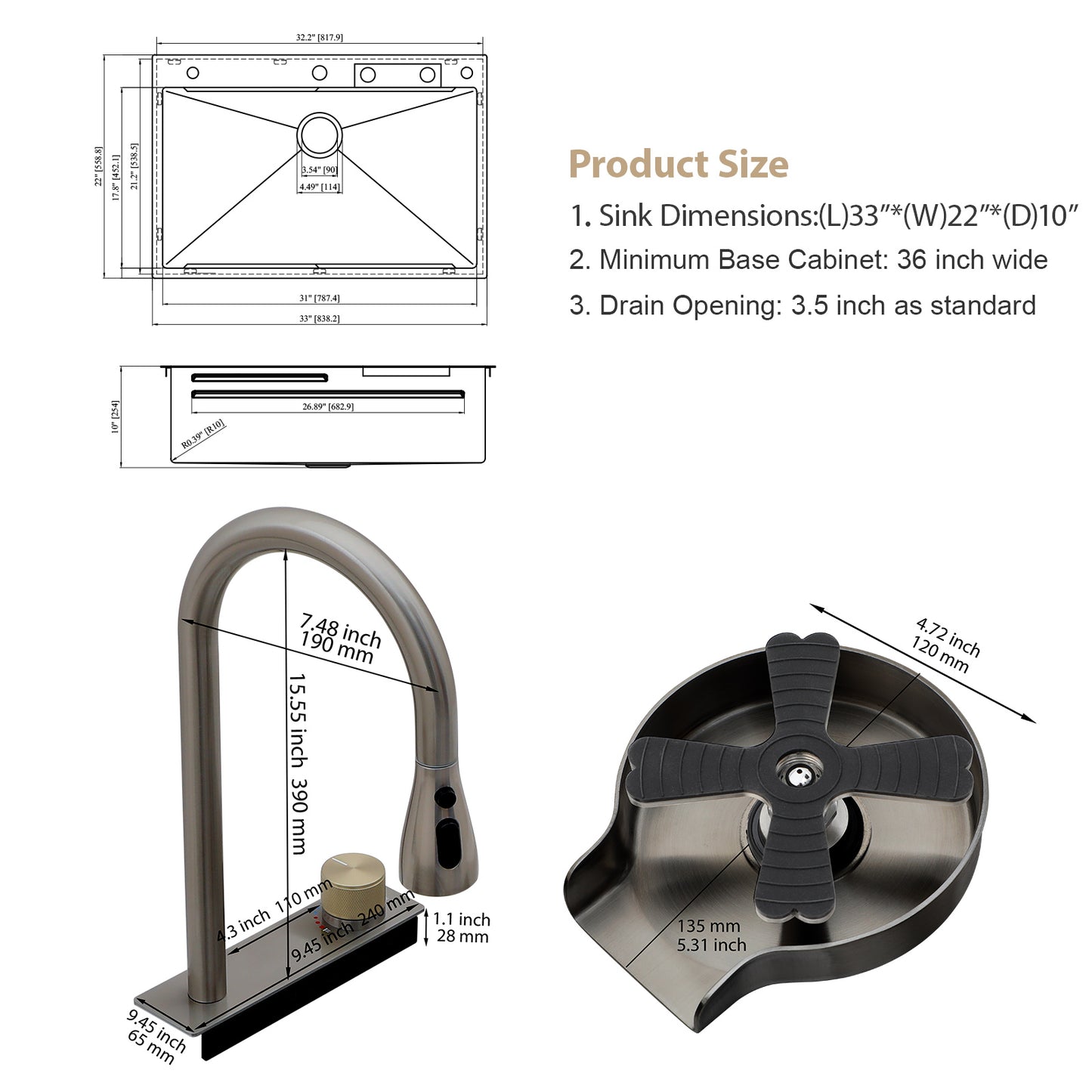 [Size & Package]- Exterior dimensions: 33" x 22" x 10" | Interior dimensions: 31" x 17.8" x 9.75" (minimum cabinet size is 36") | Standard 3.5" drain openings will fit any garbage disposal unit | PACKAGE comes with a 33 inch topmount waterfall kitchen sink, pull-out kitchen faucet, cutting board, colander, roll-up rack, bottom rinse grid, drain strainer assembly,cup rinser.(ONLY pull-out kitchen faucet included, the small faucet not included)