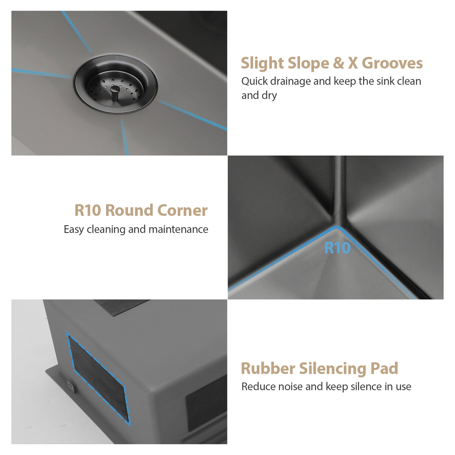 [Innovative Design sink]- This drop in workstation sink has a small sloping slope around the drain hole and an X-shaped grooved guide line at the bottom for faster drainage.3mm anti-acoustic coating and thick rubber mats for effective noise reduction. Anti-condensation coating on the back prevents water condensation and cabinet moisture. Rounded corners for easier cleaning. Deepened 10" sink accommodates large cookware.