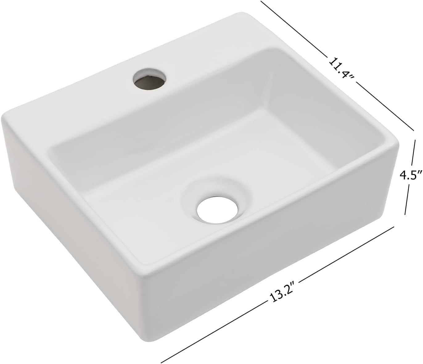 - Exterior dimensions : 13.2"x11.4"x4.5", our rectangle white bathroom sink has US standard 1.75”drain opening, please notice that: faucet and sink drains are not included in the package.