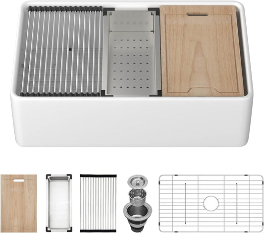 Kichae 33 Inch White Farmhouse Sink Workstation Apron Front Sink Farm Kitchen Sink with Slide Ledge Fireclay Ceramic Porcelain Single Bowl Farmer Kitchen Sink Basin with Accessories