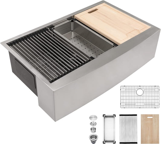 Kichae 36 Inch Farmhouse Kitchen Sink Ledge Workstation Apron Front Sink Farmer Sink Stainless Steel Single Bowl Handmade Modern Farm Style Sink with Accessories